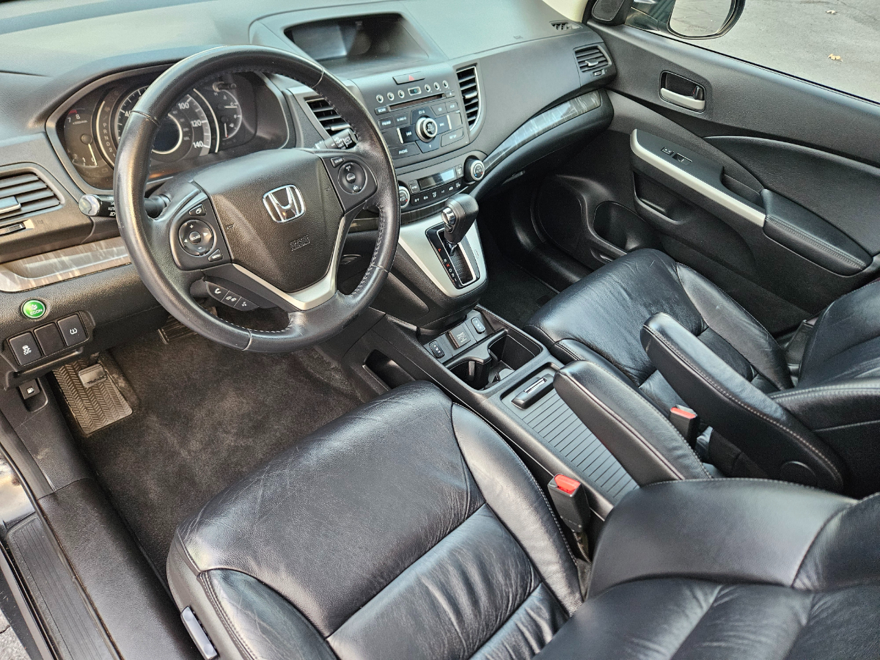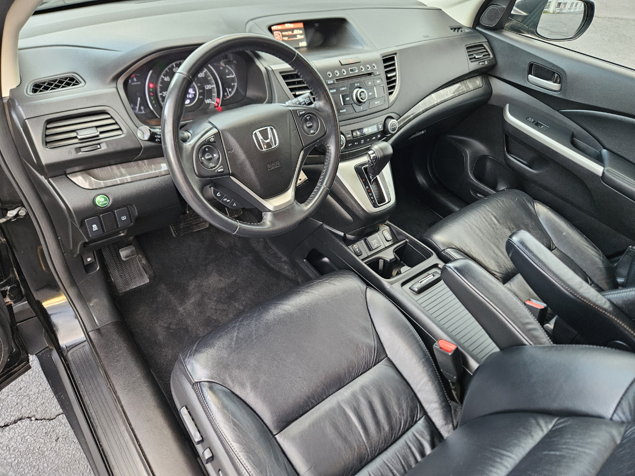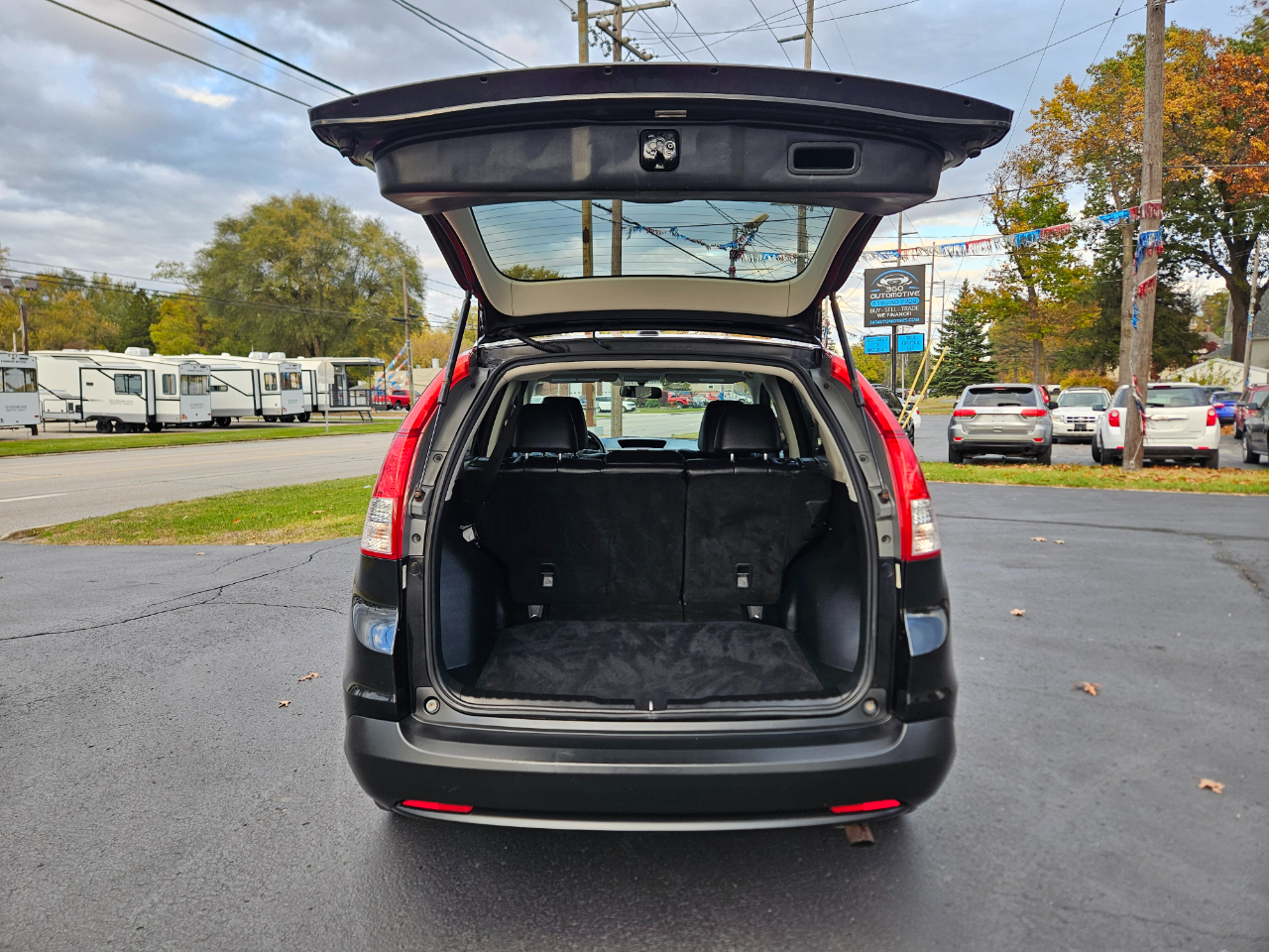 This sleek black 2014 Honda CR-V is a versatile and reliable ride that's ready to tackle any adventure with ease. With a comfortable and spacious interior, including heated front bucket seats and Bluetooth handsfreelink wireless phone connectivity, every drive will be a pleasure. This CR-V is equipped with a powerful 2.4L I-4 16-Valve DOHC i-VTEC engine that ensures a smooth and efficient performance, paired with a 5-speed automatic transmission for seamless shifting. The automatic full-time all-wheel drive capability provides added confidence for navigating various road conditions. With a stylish design featuring chrome accents, fog lamps, and a sunroof, this CR-V stands out on the road. The cargo space is practical and easily accessible, with a roll-up cargo cover to keep your belongings secure. Safety is a top priority with side impact beams, airbags throughout the cabin, and a convenient backup camera for added visibility. Get behind the wheel of this Honda CR-V and experience the perfect blend of comfort, performance, and style on your next journey.